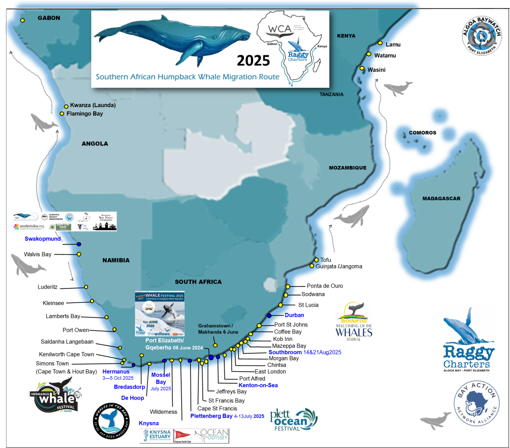 Humpback Whales migrate from Antarctician seas to Sub-Saharan coastal waters and visiting our Bays from late May to November of each year. BANA takes a message of conservation, hope and prosperity to the bays of these annual migration routes. In 2023 we have been to 31 different locations spreading the word!!